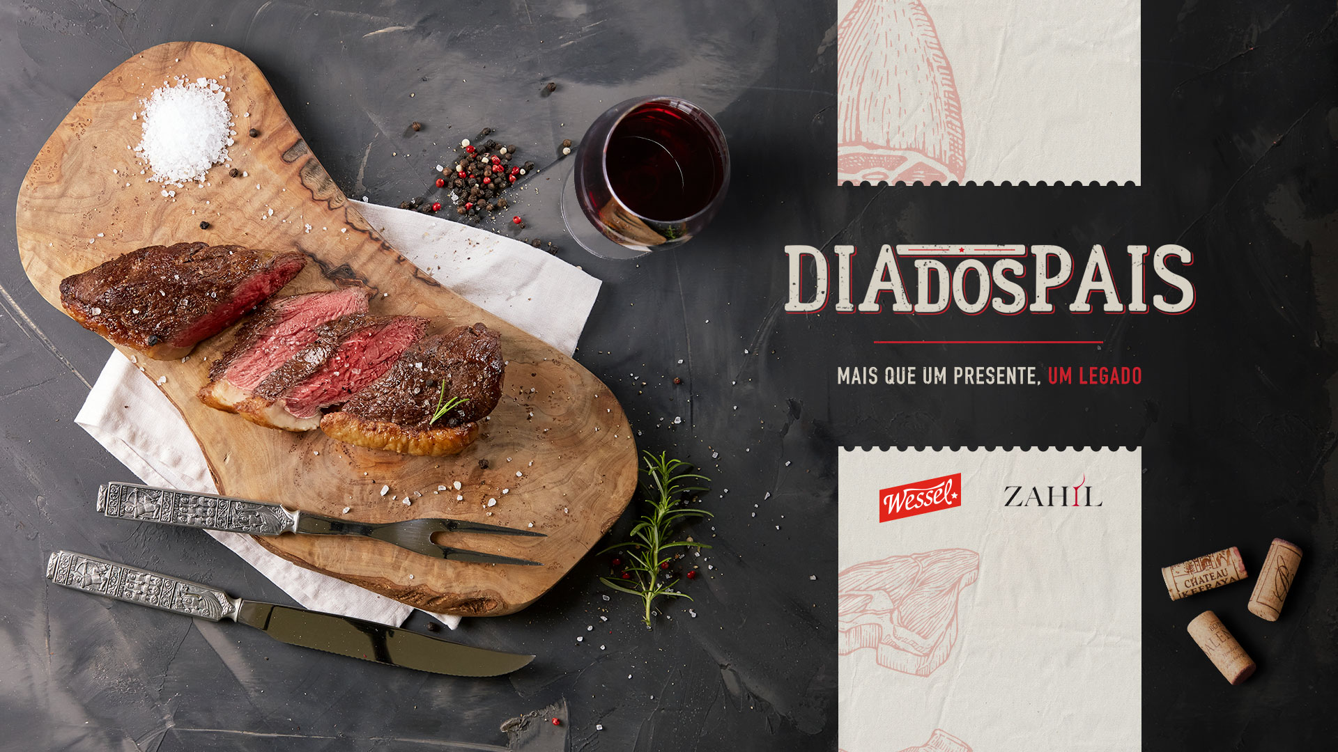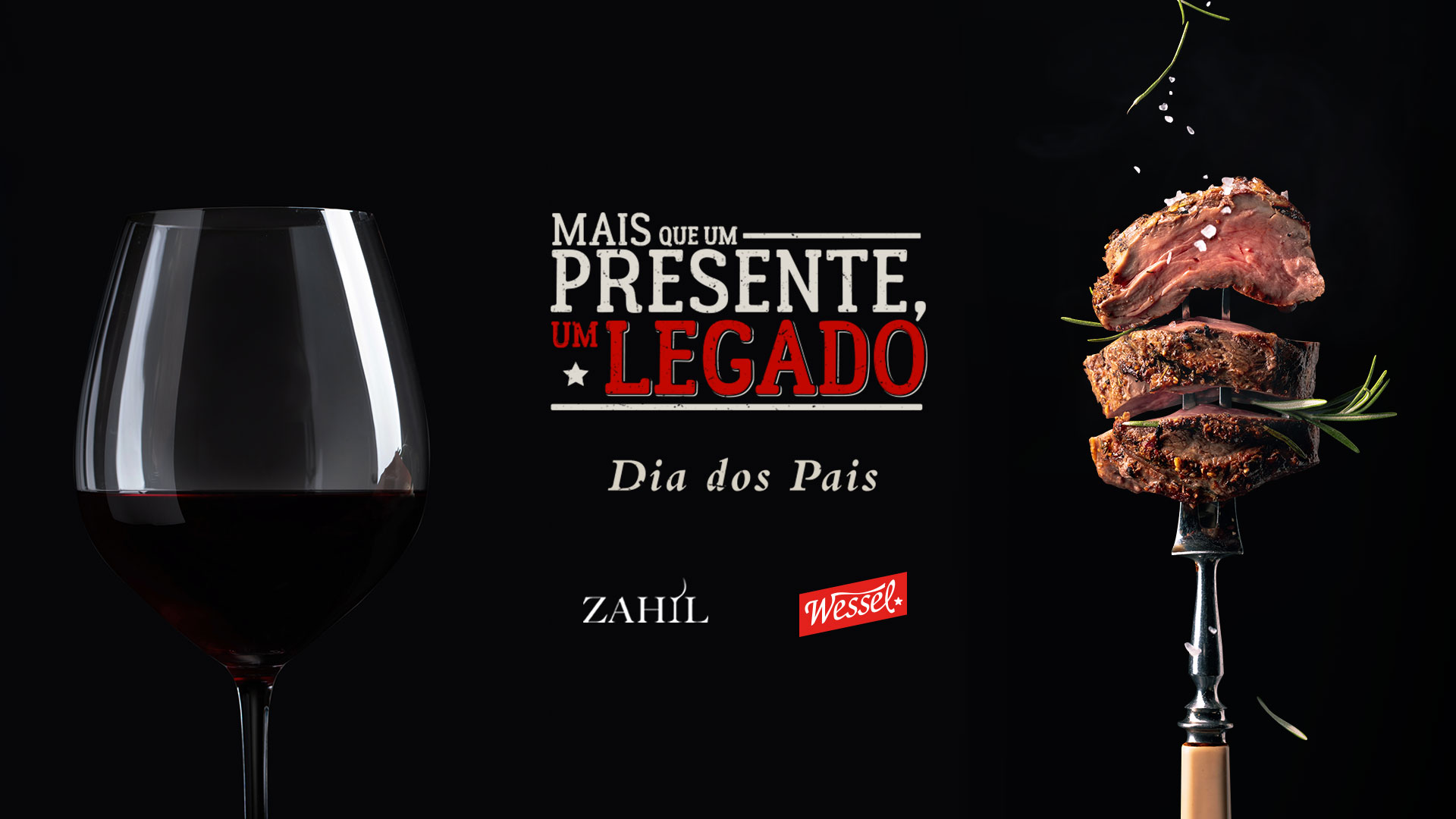 Desenvolver uma campanha de Dia dos Pais reverberando o peso do legado Wessel, e a mecânica promocional que harmoniza a marca à importadora Zahil, proporcionando ao consumidor a chance de presentear o pai com cortes e vinhos premium.